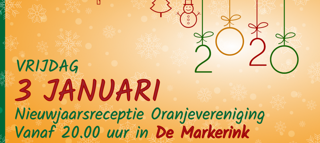 Nieuwjaarsreceptie 2020 Gepubliceerd op 14 december 2019Auteur Barlo 03-01-2020 20:00 – 00:00 Vrijdag 3 januari is weer de nieuwjaarsreceptie van de Oranjevereniging en Activiteitencommissie Barlo. Iedereen is van harte uitgenodigd om het jaar goed te beginnen en de beste wensen over te brengen.