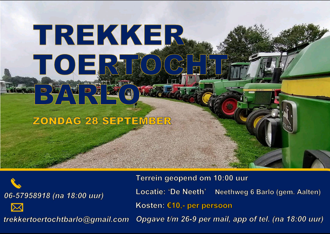 Aanmelden is mogelijk tot vrijdag 26-09, dit kan door het invullen van het aanmeldformulier, te mailen naar trekkertoertochtbarlo.nl