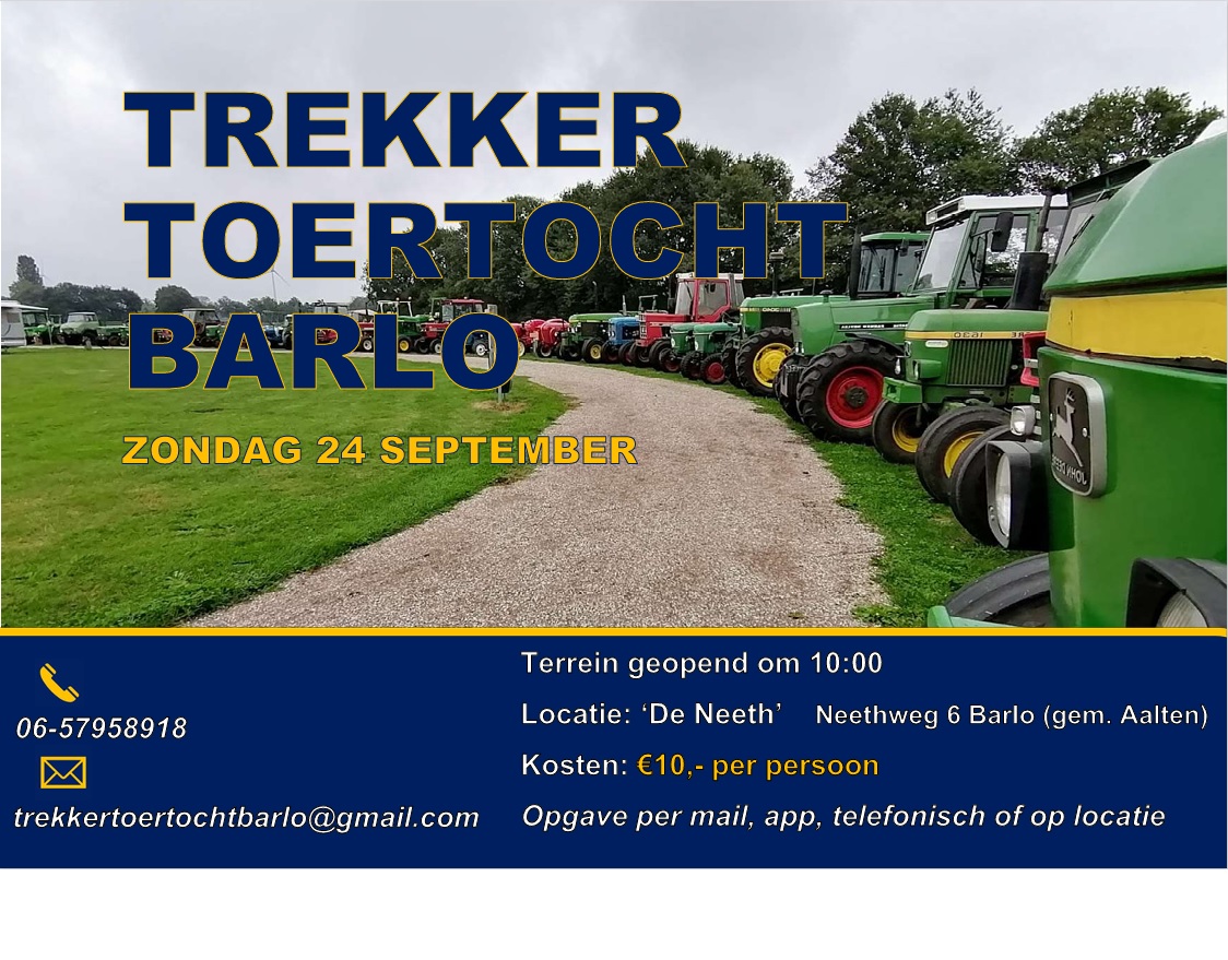 Aanmelden is mogelijk tot vrijdag 22-09-2023 18:00, dit kan door te mailen naar trekkertoertochtbarlo@gmail.com